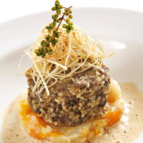 - To serve, put a spoonful of hot apple puree on each plate. Place a hot black pudding slice in the centre of the puree. Add the Calvados to the sauce as a final seasoning and spoon around the plates. Serve immediately.